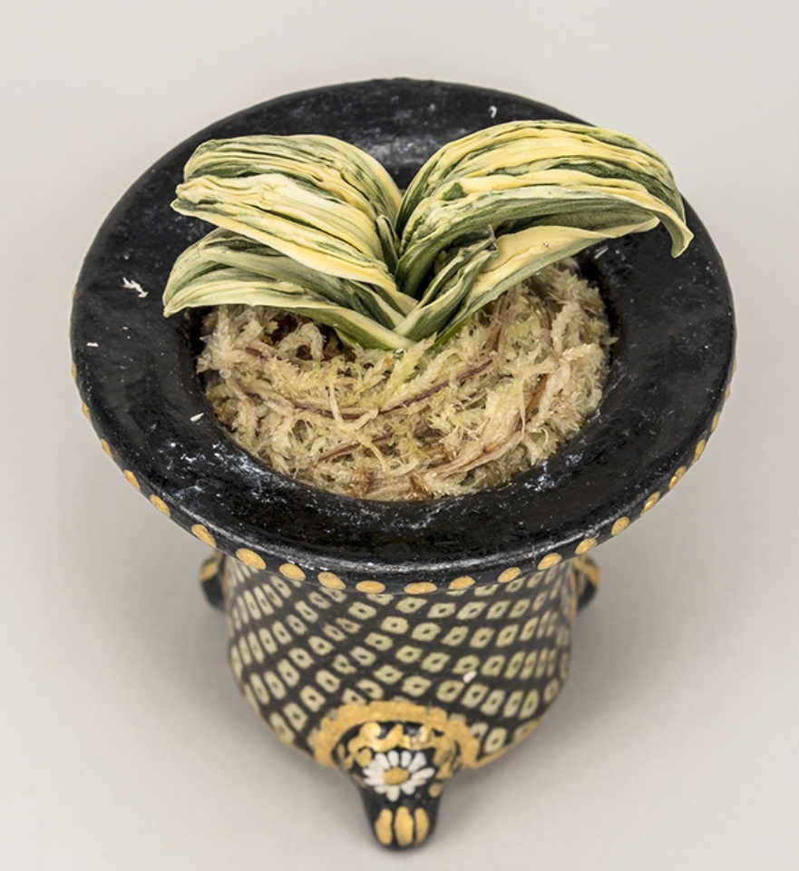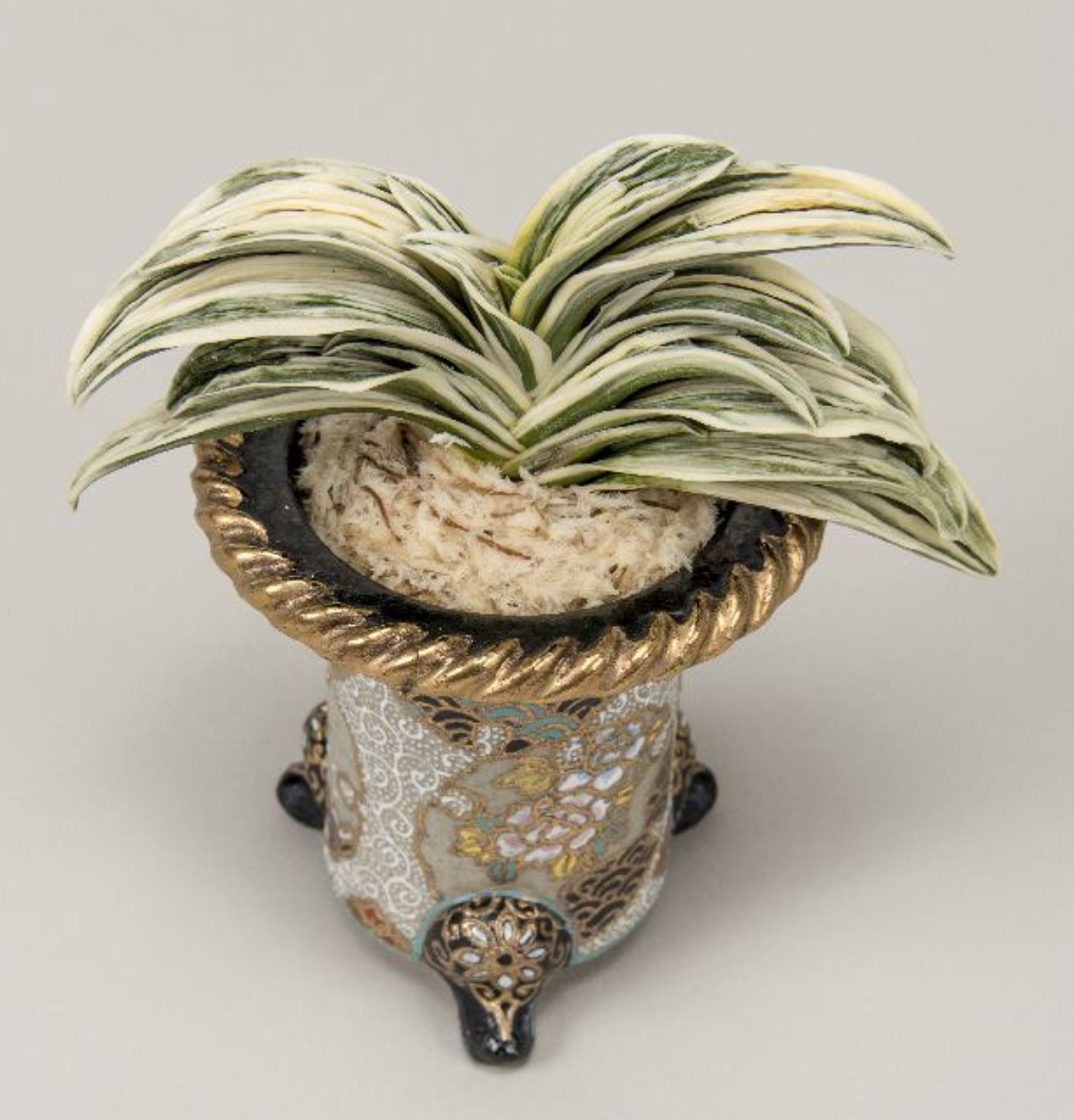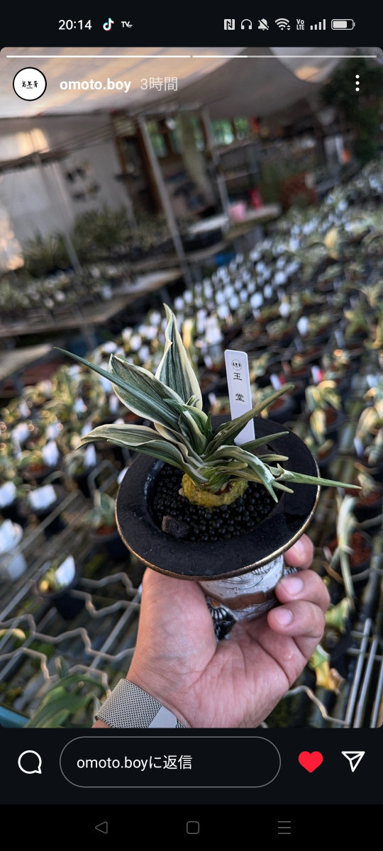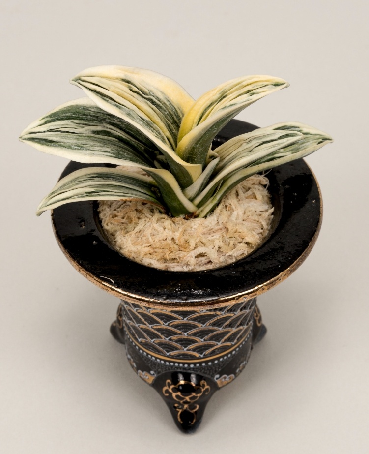 中型種。『日比野実生』とよばれていた頃から品質には定評がある。肉厚の葉には高く粗い雅糸竜と細かい雅糸竜を見せる。葉の縁を彩る覆輪にビリが大きく波打ち、本種であることを一目で理解させる。淡い地合いはやや粗く、柚子肌で艶消しである。力強さと淡い色合いが、不思議なほどに調和のとれた絶品でもある。性質は普通。採光・施肥はやや弱め。全体が淡い黄色みのある葉のため葉焼けを起こしやすいので要注意。子上げ芋吹きも良好だが、芯がたまに止まることがある。